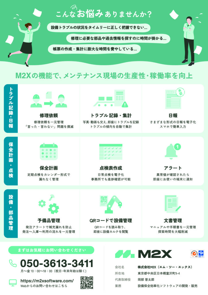 M2Xは、設備保全業務を一気通貫で効率化するクラウドシステムです。