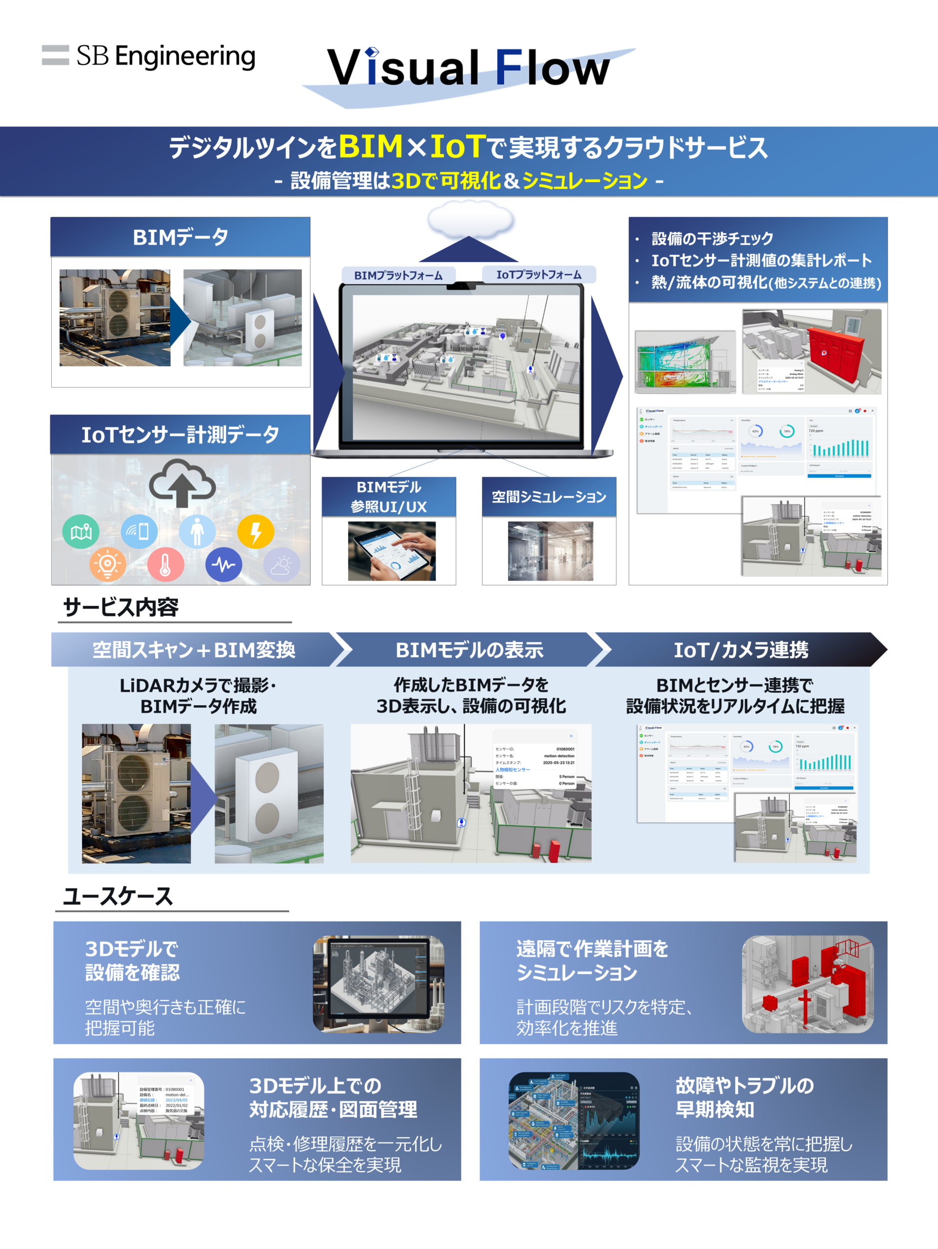 Visual Flowは施設・設備を3D空間で再現し、BIMやIoTセンサーのデータを活用して設備の稼働状況の可視化、点検記録の一元管理、 作業計画のシミュレーションを実現するサービスです。