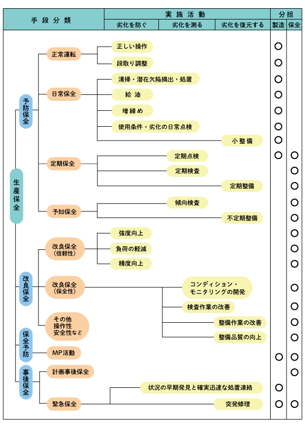 また保全活動は、その手段分類から、表のように「事後保全」「予防保全」「改良保全」 「保全予防」に分けることができます。
