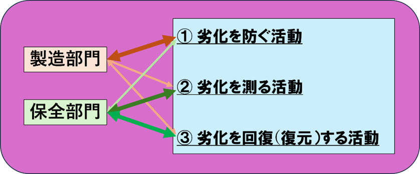 製造部門が担当する保全の活動は、おもに「① 劣化を防ぐ活動」です。製造部門が「① 劣化を防ぐ活動を」進めることで、保全部門は、「① 劣化を防ぐ活動」に多くの時間を取られないで済むようになり、専門的な知識を要する「② 劣化を測る活動」「③ 劣化を復元する活動」に力を集中できるようになります。