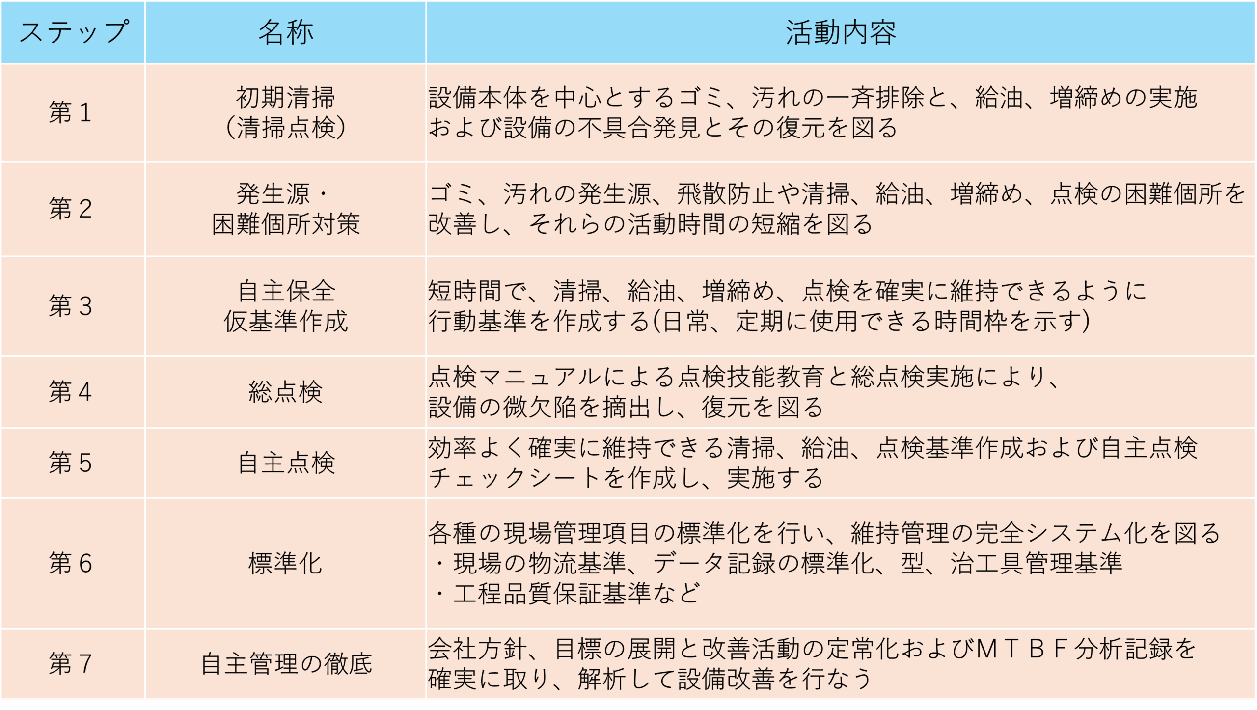 自主保全の活動は、職制主導による全員参加で「ステップ方式」で進めることが特徴です。