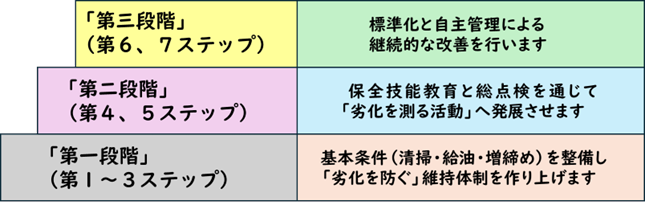 ・「第二段階」(第4、5ステップ)は、保全技能教育と総点検を通じて、「劣化を防ぐ活動」から