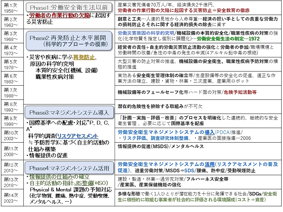 Phase2の労働安全衛生法の成立とともに、科学的方法論が整い始める。TPMが提唱された時期にも重なり、設備管理では「故障に学び再発を防止せよ(PM分析を含む)」と教わった。災害防止もまさにこの予防哲学と同軌にあったと思う。