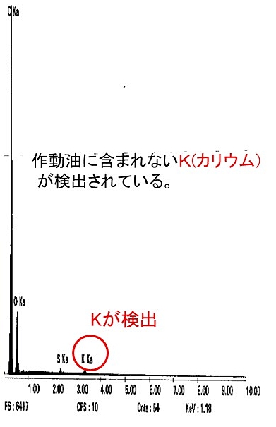 (4)図2の蛍光X線分析では、作動油には添加されていないK(カリウム)が検出されました。以上のことから、作動油にK(カリウム)を含むポリマー状の物質が混入し、このポリマー状物質が粘着性のスラッジを生成したものと考えられます。