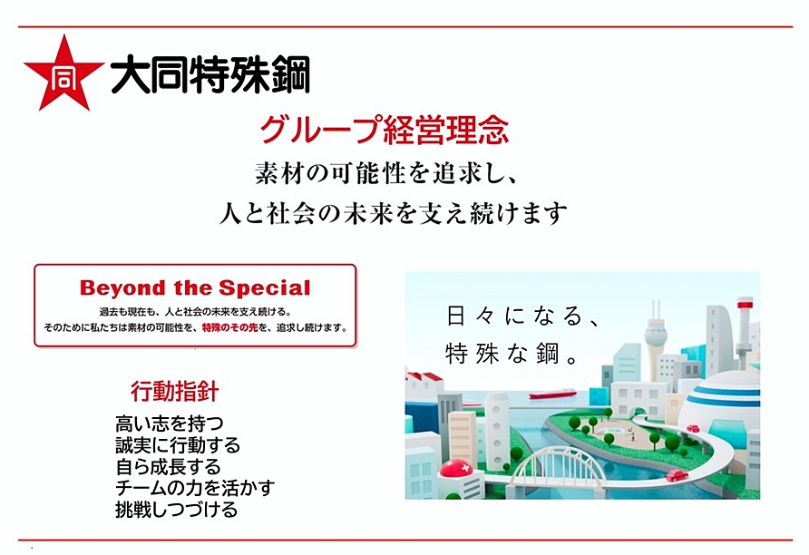 大同特殊鋼株式会社は、『日本の電力王』とも呼ばれた福沢桃介が、水力発電による余剰電力を利用した電気炉製鋼の事業化を目指し、1916年に創業した。創業100周年を迎えた2016年、大同特殊鋼グループが一体感を持って活動できるように、また、大同特殊鋼グループの社員1人ひとりが「特別を越える価値」を提供し、情熱を持って人や社会を支え続ける存在でありたいとの思いを込め、スローガン「Beyond the Special」を制定した(図表-1)。