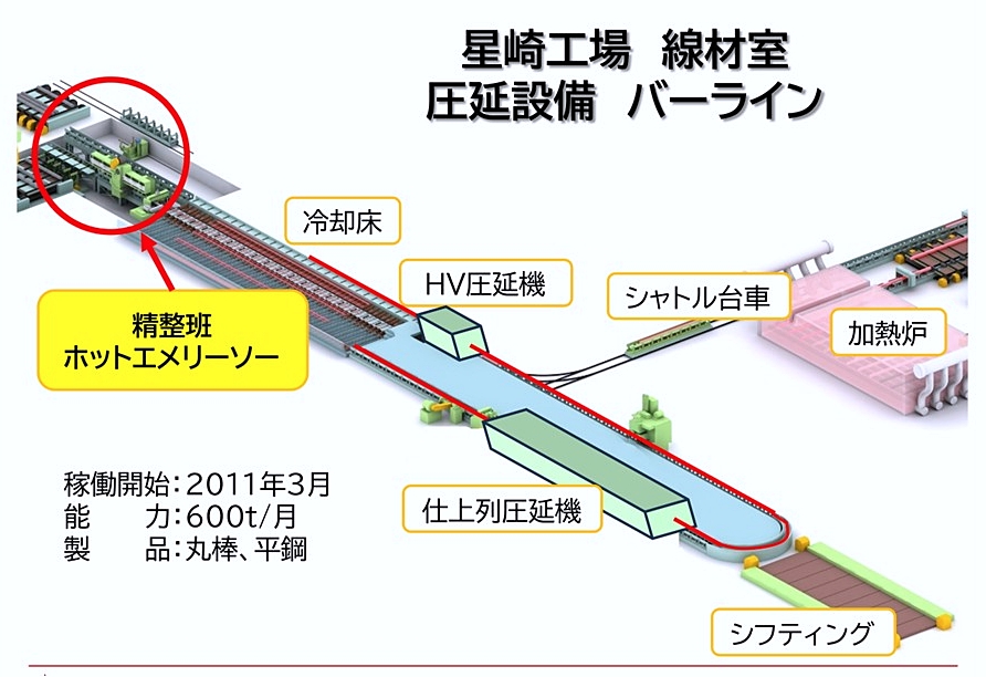 私が所属する線材圧延工場バーラインは、加熱された鋼塊(ビレット)を圧延機で熱間圧延し、丸棒や平鋼を生産しており、私は精整班で圧延材を切断・集束をする設備を担当している(図表-3)。