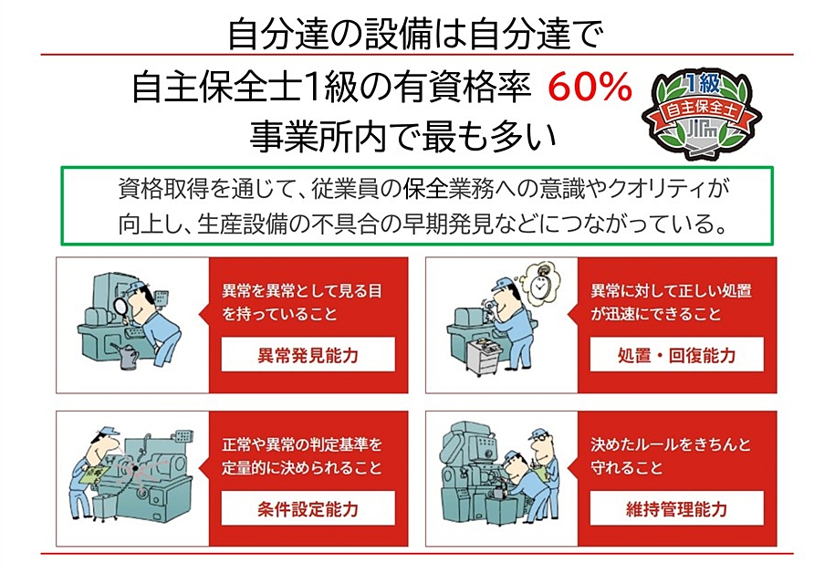 そして、私たちの職場の自主保全士1級の取得率は60%で、星崎工場内でもっとも高い。資格取得をつうじてオペレーターの保全業務への意識やクオリティが向上し、設備の不具合の早期発見などにつながり、星崎工場内でNo.1の自主保全力を自負している(図表-5)。