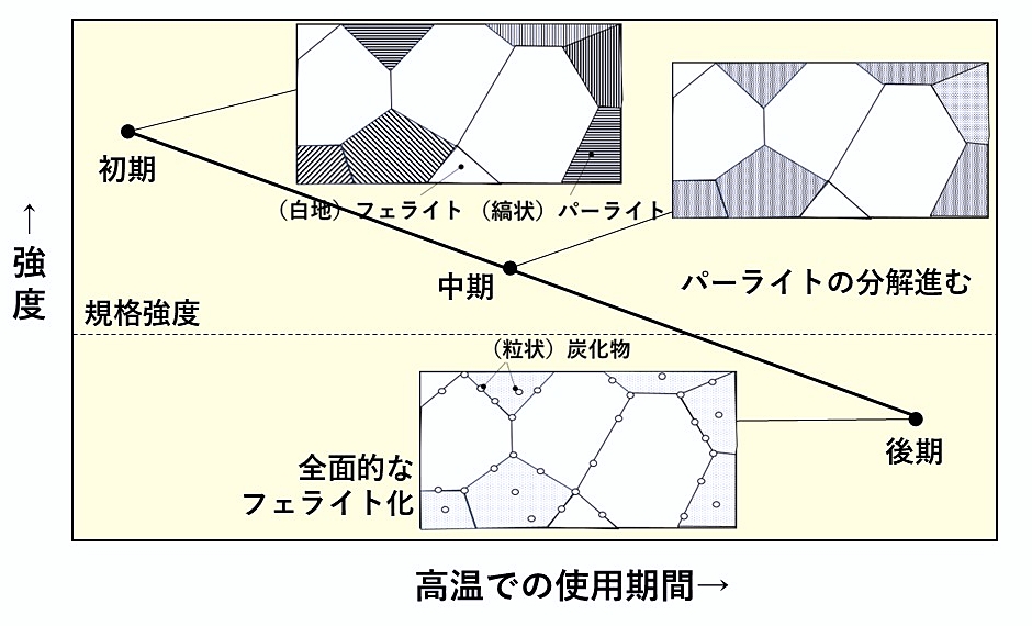 炭素鋼は、同図中の初期に示す様に縞状に示すパーライト組織で、鉄と炭素の化合物が層状に分布することにより、強度を発現している。その層状の炭素鋼中の炭化物が、400℃以上程度の長期間の使用で、徐々に球状に変化し、材料としての強度の低下する現象が「炭化物球状化」である。強度の低下速度は、金属組織により異なり、温度が高いほど早い傾向がある。