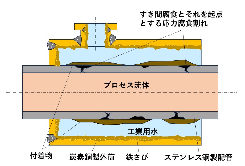概要報告書では、管内のプロセス流体の温度、ステンレス鋼の鋼種、および工業用水の水質は明記されていないが、プロセス温度が50℃程度以上で、SUS304等の汎用ステンレス鋼管が採用されていたと仮定すると、塩化物イオンを含有する冷却水より付着物(スケールやスラッジの混合物が想定される)が発生し、それとステンレス鋼のすき間部で、すき間腐食が発生し、これを起点とした応力腐食割れが発生したと考えられる。