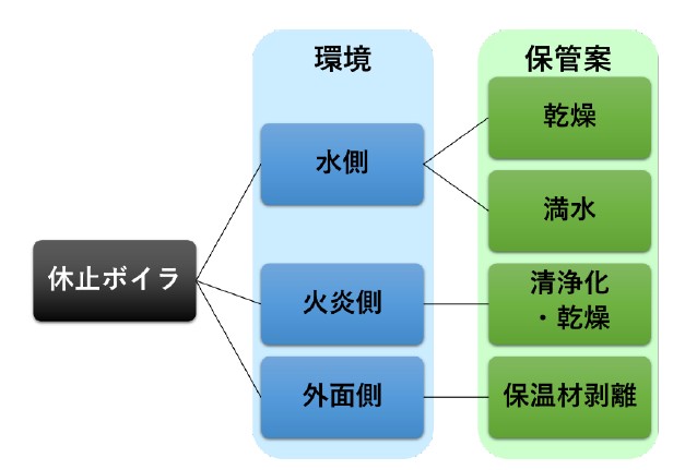 休止時の管理の考え方と保管方法例を図に示す。この図に示す様に、一般にボイラには「水側」、「火炎側」および「外面側」の3種類の環境がある。それらの環境毎に休止中の防食対策を実施する必要がある。