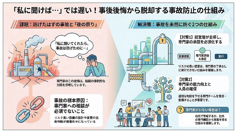 1つ目は、技術を統括する経営者クラスに、リスクの高いプロセスの設計や条件変更の提案に関しては、必ず材料技術等の専門家に問い合わせ、その承認を得ない限りそれらが実行に移せない仕組み作りを提案し、決断してもらうことである。