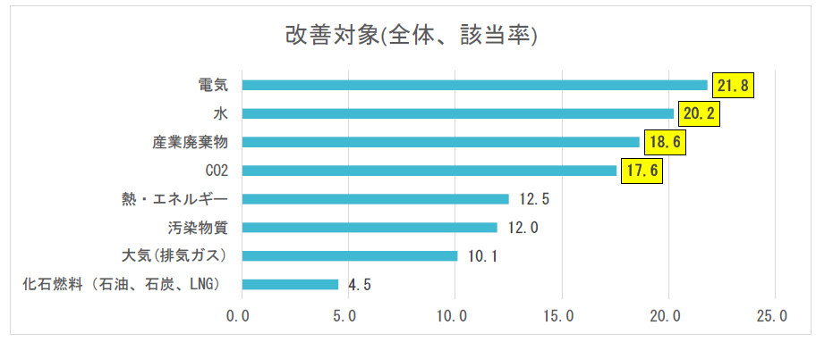 2023年度TPM優秀賞受賞事業場を対象に調査した結果、改善対象は図表―1のとおり、電気、水、産業廃棄物、CO2が上位を占めていました。